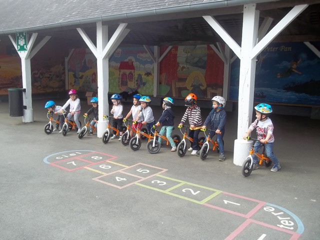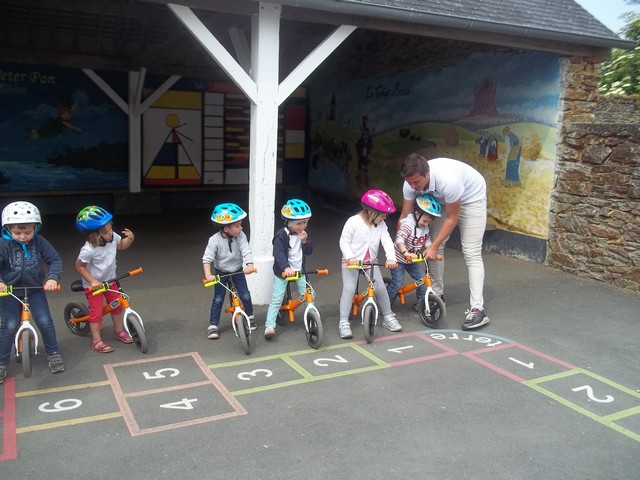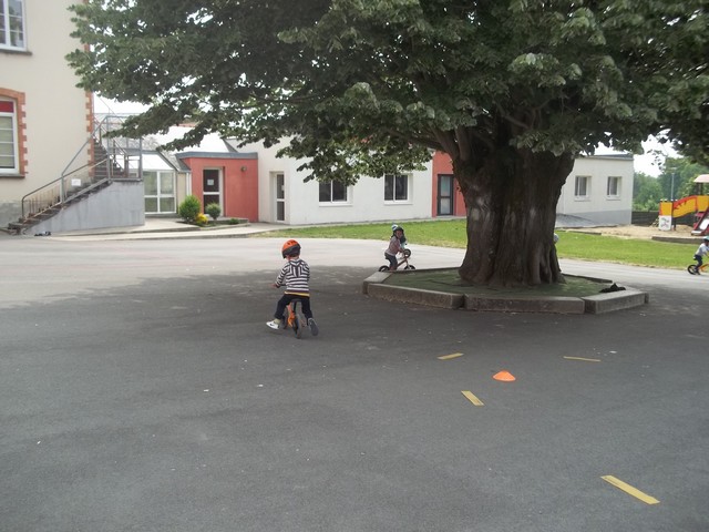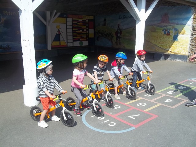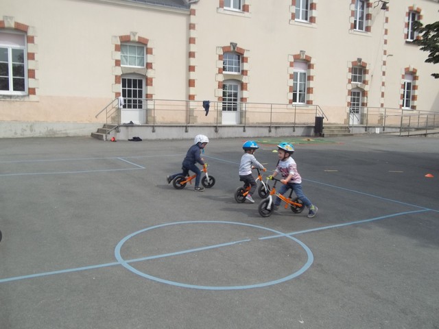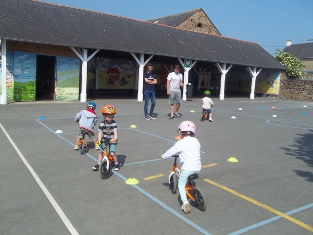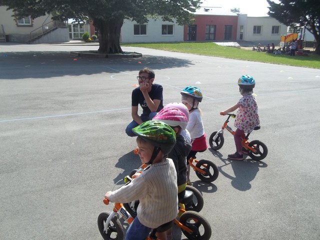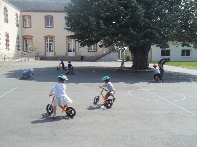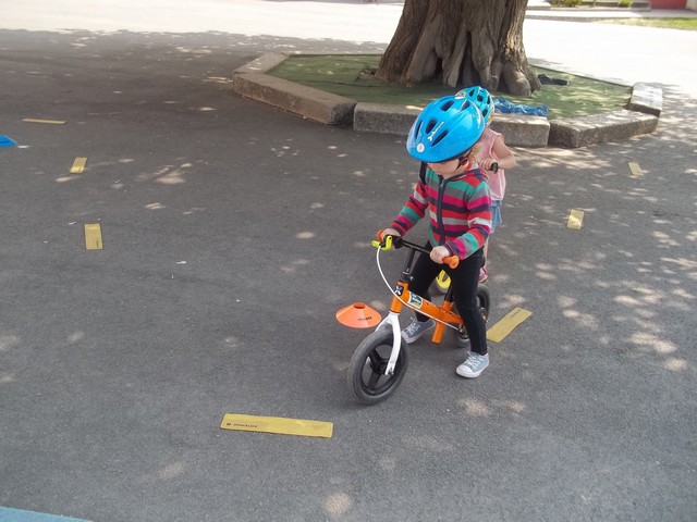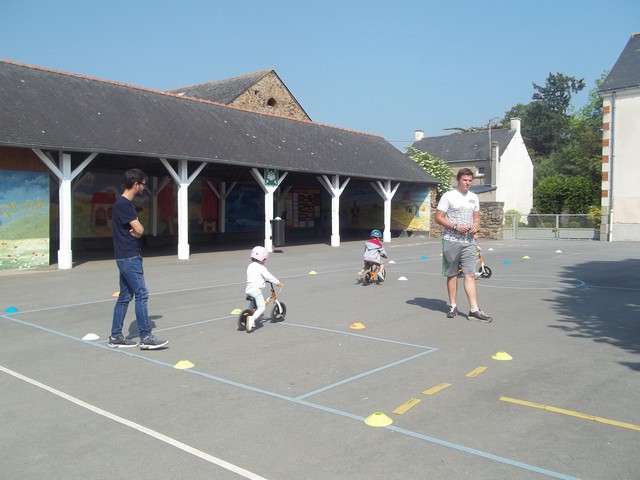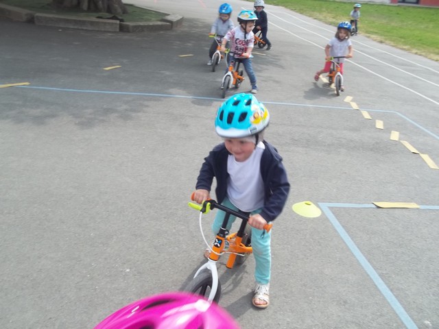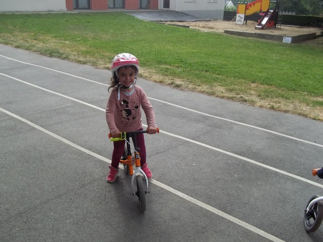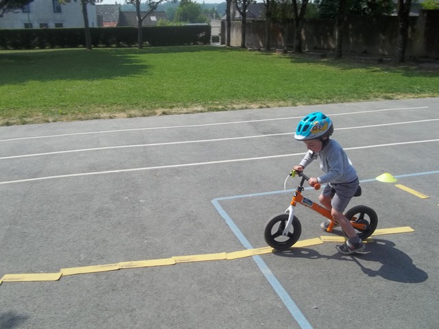 Ensuite nous avons fait un parcours : apprendre à freiner (en se servant du frein et non des pieds…), suivre la ligne, faire un slalom entre les plots et finir aussi vite que possible sur la ligne droite.