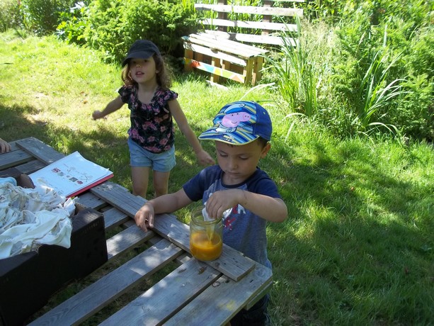Jeudi 4 juillet, dès 9h, direction le jardin de Pirouette où Marité et Manu nous attendent pour des activités autour du livre « le loup dans le potager ». Accompagnés de mamans et de mamies, nous avons participé à des ateliers de peinture, jardinage, jeu de kim, jeux de société, labyrinthe… Nous avons fait des découvertes extraordinaires et nous nous sommes bien amusés !