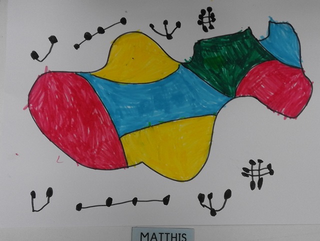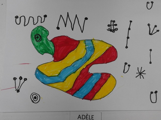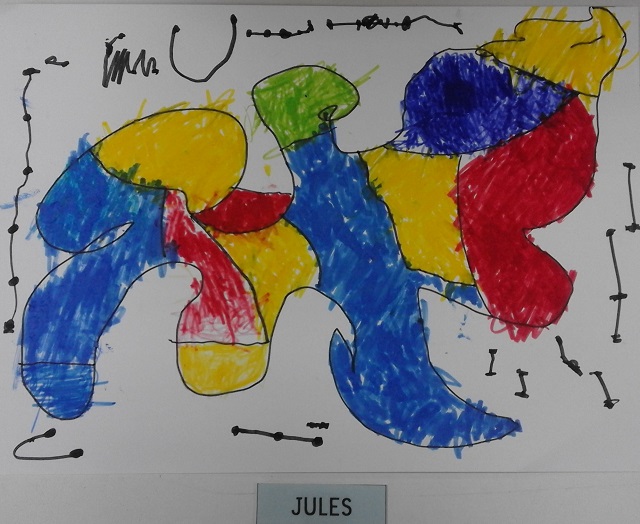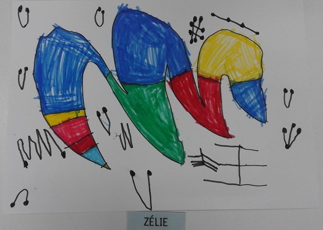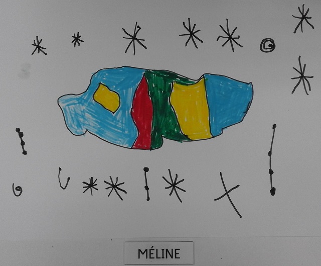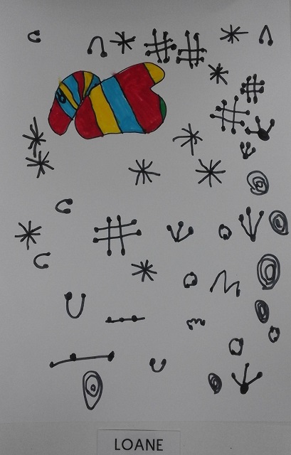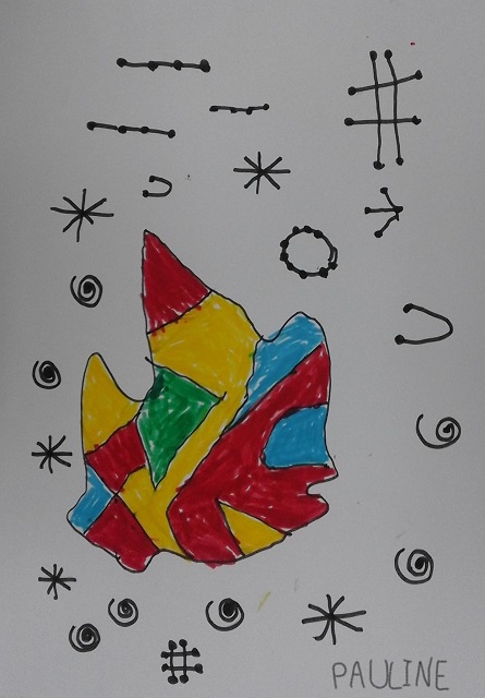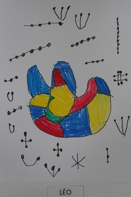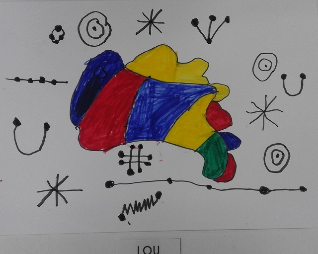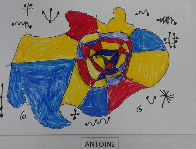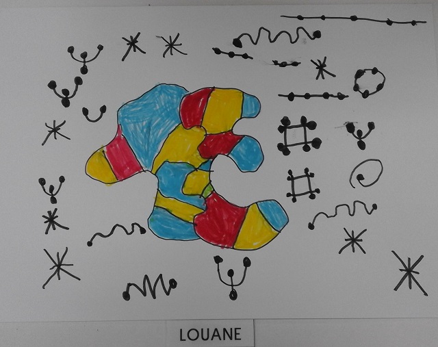 Après cette étape de découverte, nous nous sommes entrainés à reproduire les graphismes de Joan Miro. Puis les enfants ont chacun réalisé leur œuvre à la façon de Joan Miro. Voici les photos des œuvres exposées dans la classe: