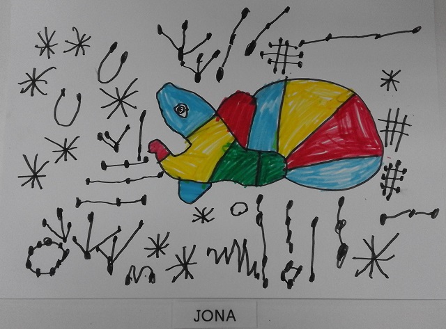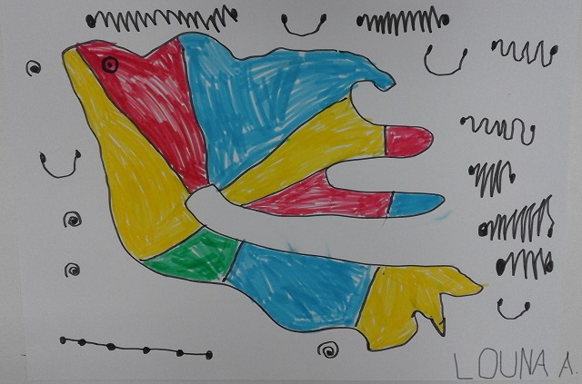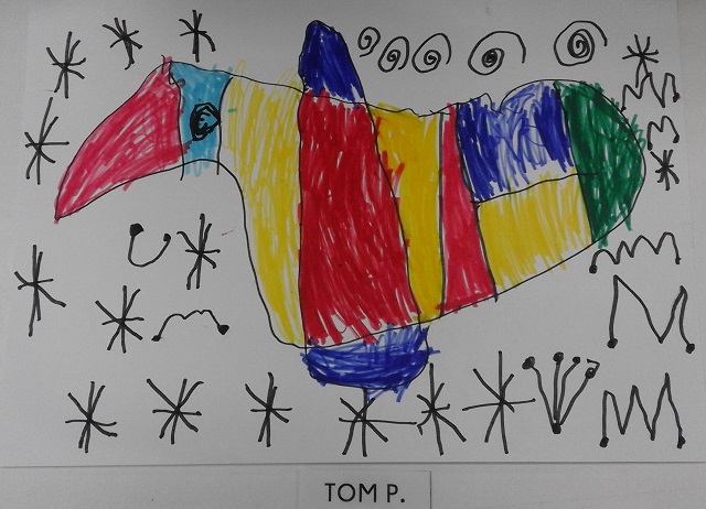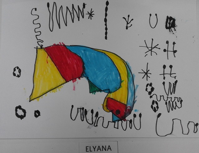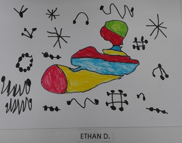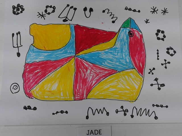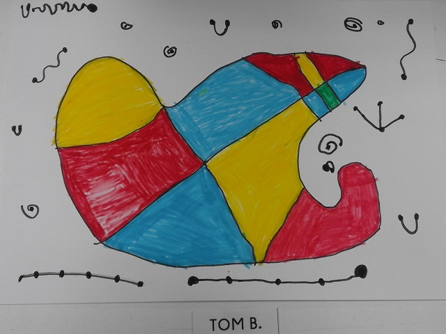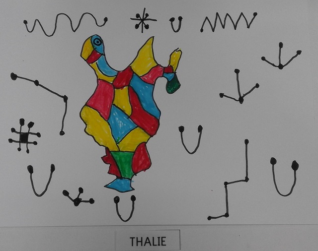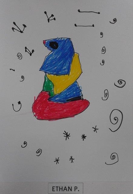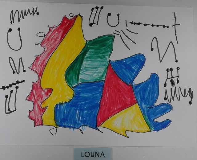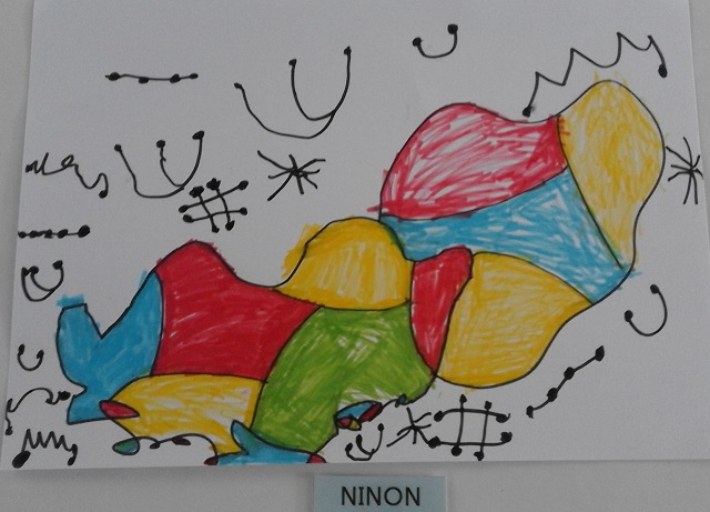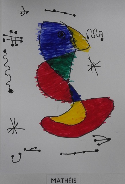 Après cette étape de découverte, nous nous sommes entrainés à reproduire les graphismes de Joan Miro. Puis les enfants ont chacun réalisé leur œuvre à la façon de Joan Miro. Voici les photos des œuvres exposées dans la classe: