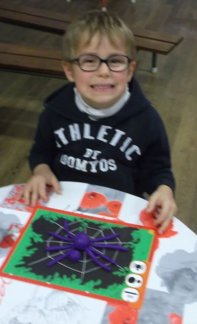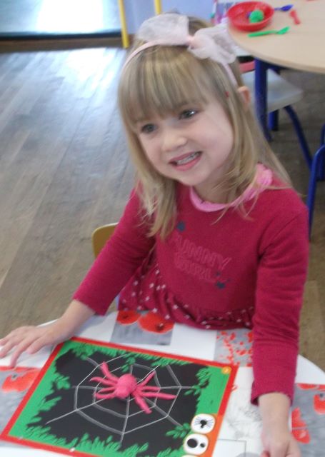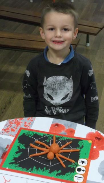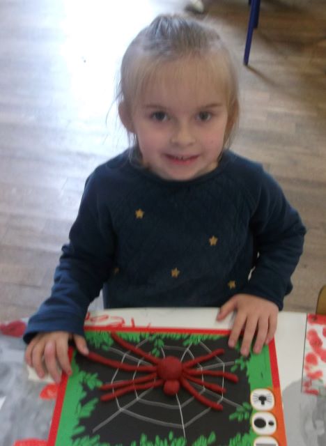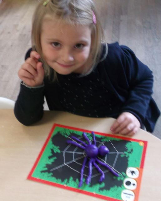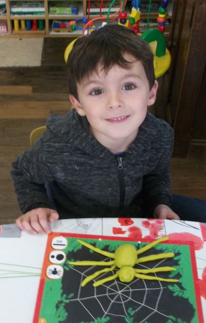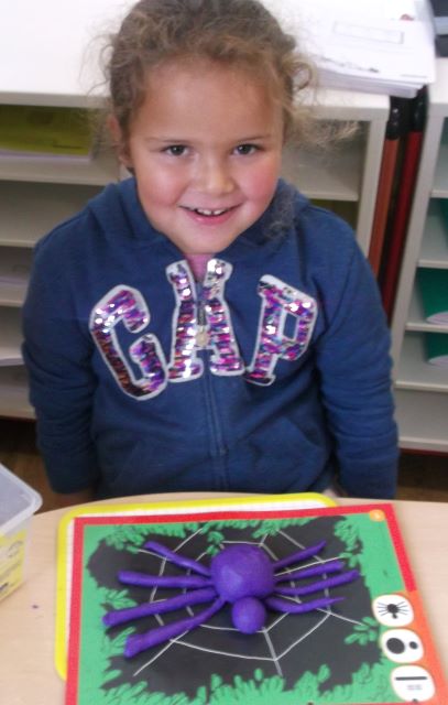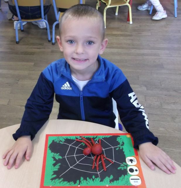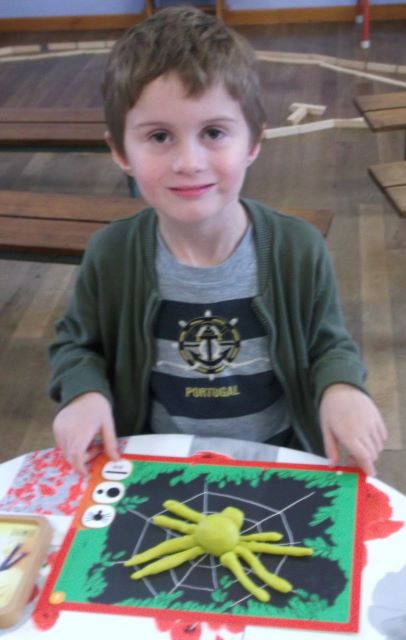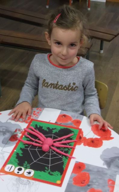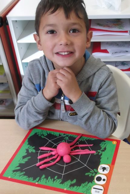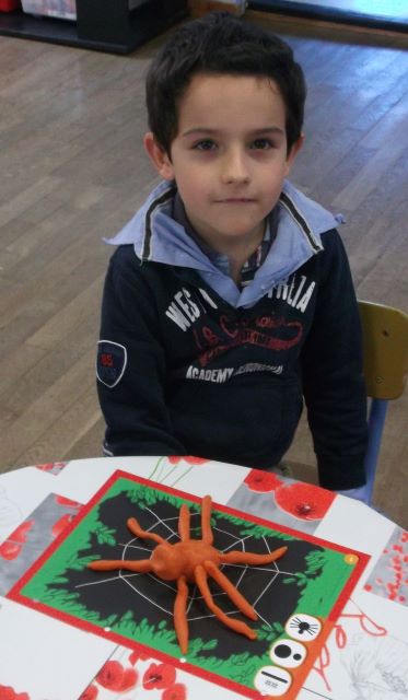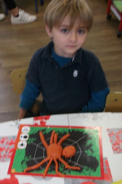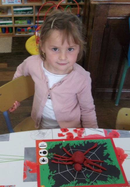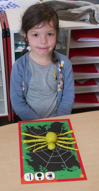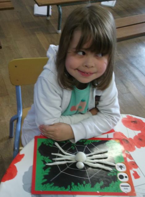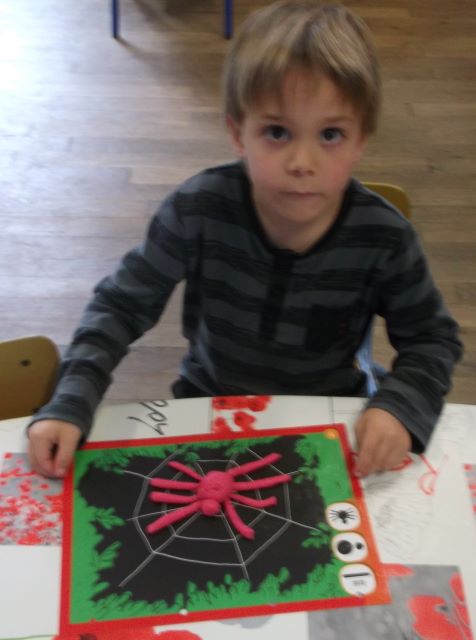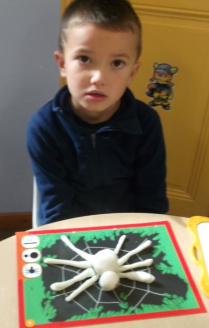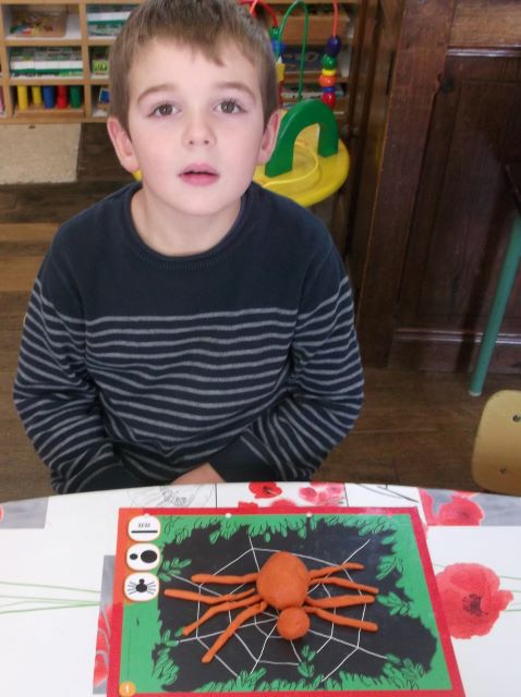 Les GS avaient à faire 8 colombins et 2 boules puis à les assembler pour réaliser l’araignée sur sa toile.