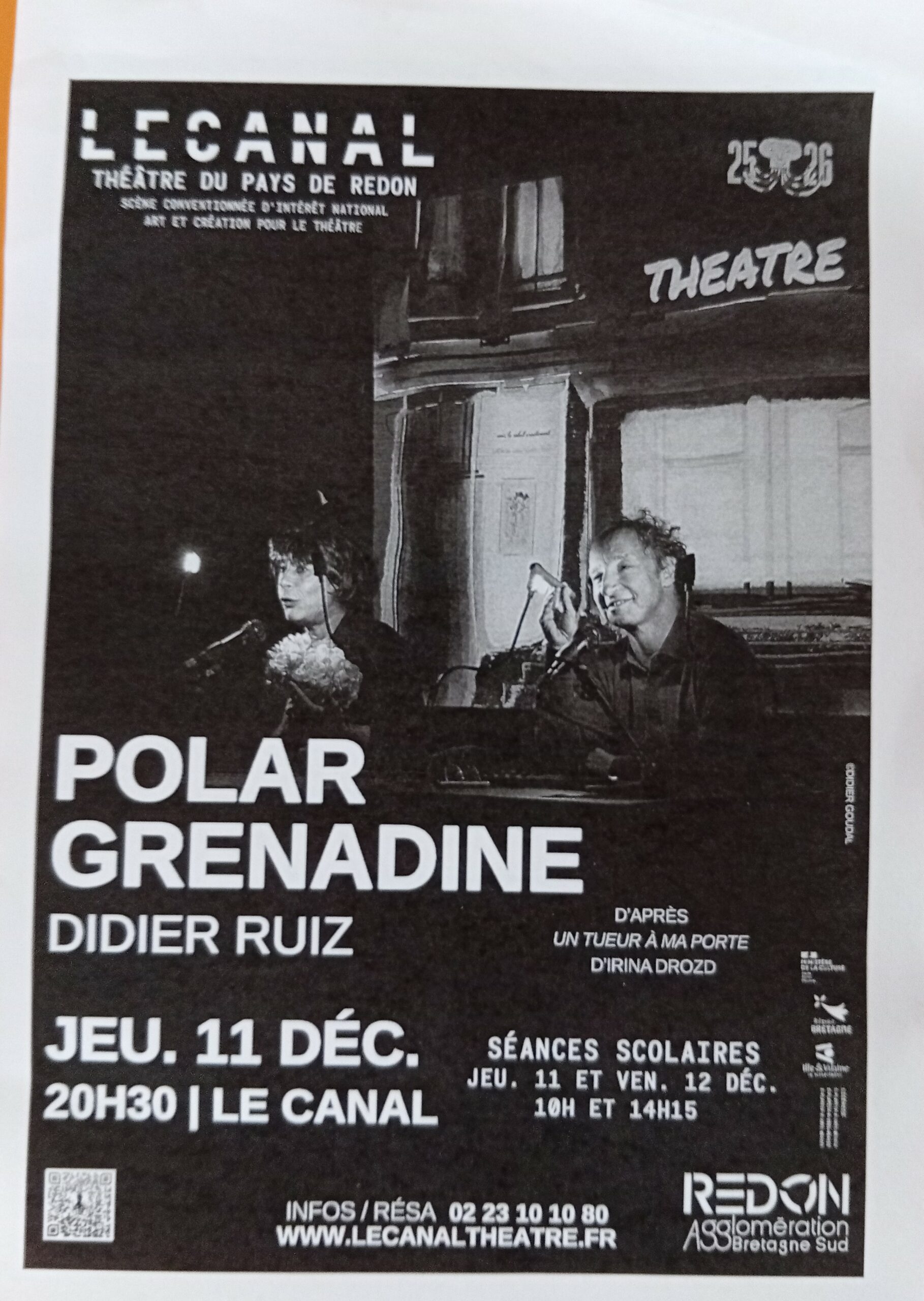 Vendredi 12 décembre les CE2/CM1 et les CM1/CM2 de l’école Notre Dame sont allés au théâtre de Redon pour assister à la pièce, « Polar grenadine », qui est l’adaptation d’un roman jeunesse « Un tueur à ma porte » d’Irina Drozd. À l’issue de cette enquête haletante, un moment convivial était proposé autour d’une grenadine pour partager les sensations de chacun.